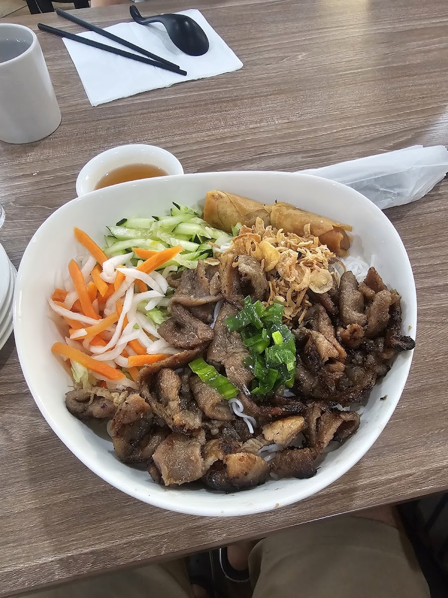 Beyond pho, the menu offers a range of familiar Vietnamese staples that make the place feel like a complete dining destination rather than just a noodle shop. Vermicelli bowls come topped with grilled meats, crisp vegetables, and light fish sauce dressing, creating a refreshing contrast to the heavier soups. The grilled pork version stands out with its slightly caramelized edges and smoky aroma. There are also rice plates and spring rolls, which make great starters if you’re sharing with a group.